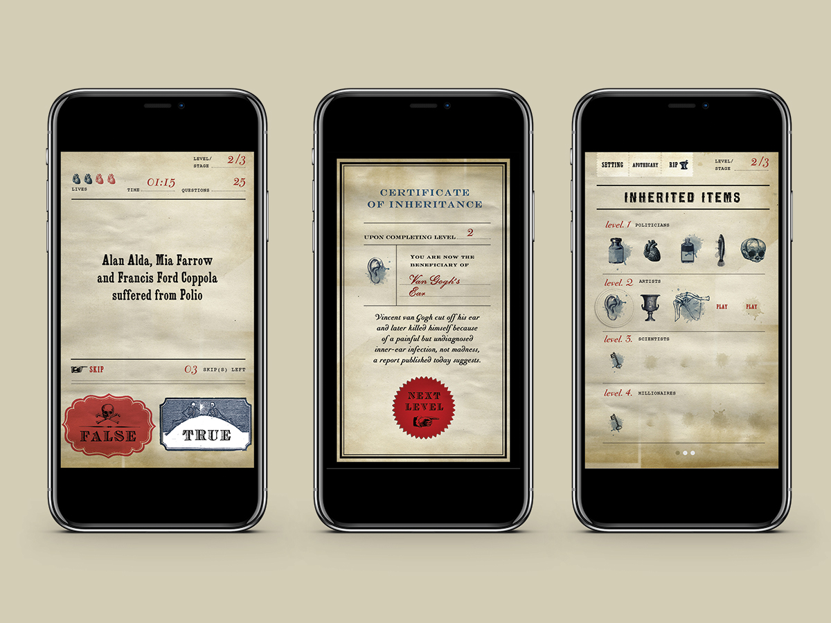 In this trivia game, users answer questions about famous celebrities, atheletes, politicians about their health, diseases they had, and ultimately, the causes of their death. As you level up you obtain more facts and detailed stories of life and death of a person.